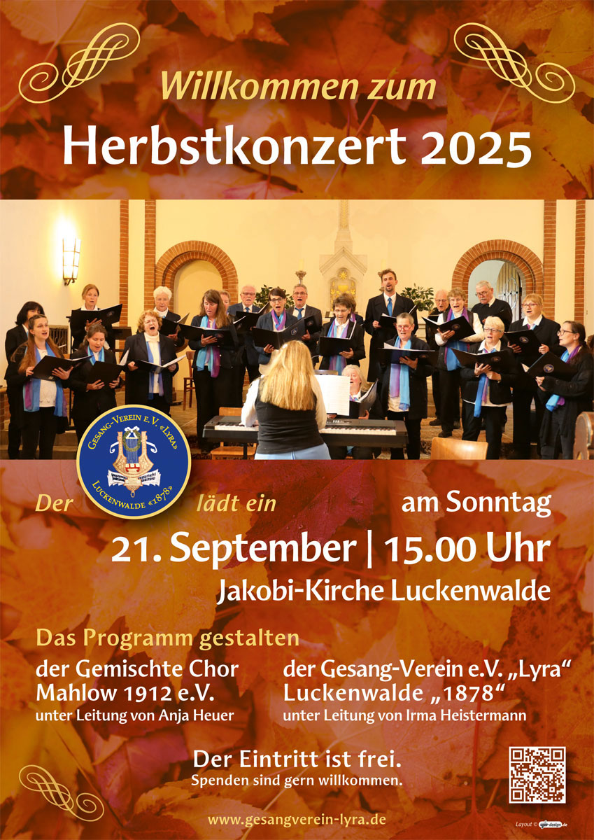 15.00 Uhr - Der Gesang-Verein e.V. „Lyra“ Luckenwalde „1878“ lädt alle Freunde des Chorgesangs zum Herbstkonzert in die Jakobikirche ein.